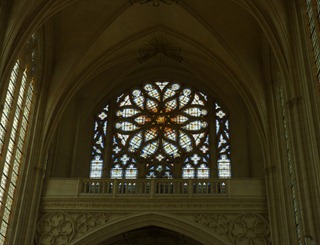 The chapel is empty. It has six nave windows that were destroyed by a storm and they have just been replaced with a formal patterned stained glass. The magnificent apse windows are of the Apocalypse and will be restored shortly. The stonework and vaulting inside has also been restored and is plain except around the peak of the vaulting where the bosses are elaborated with painting. Very lovely indeed.